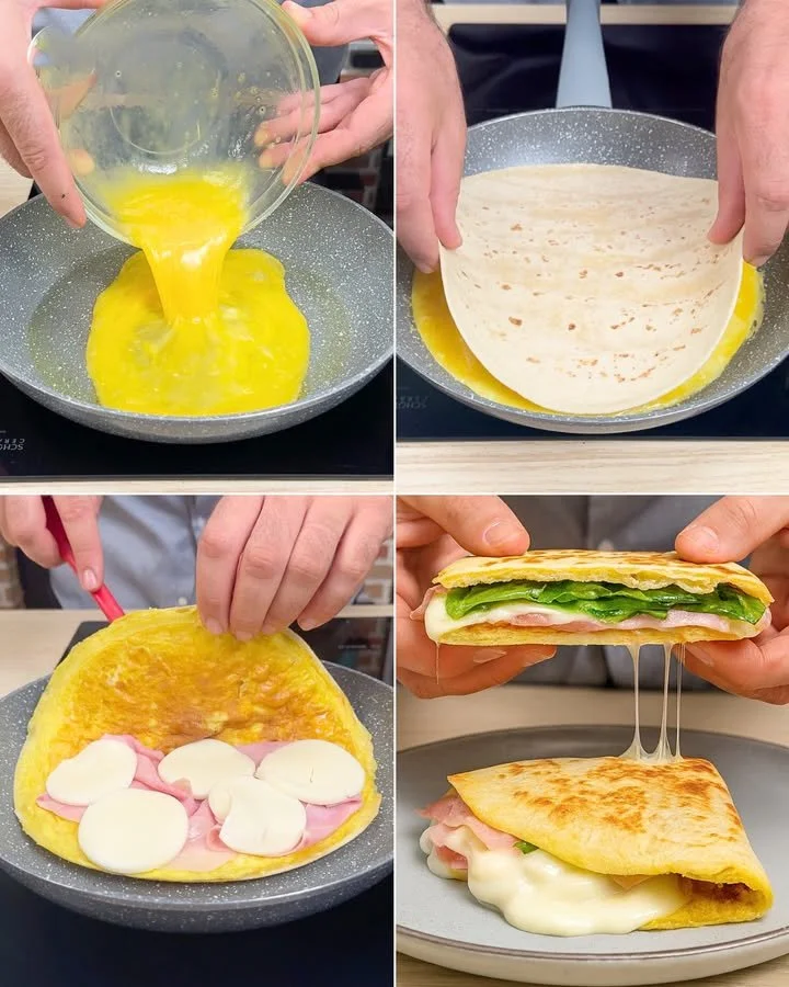 - Die Tortilla in die Pfanne legen und die Eimischung daraufgeben.