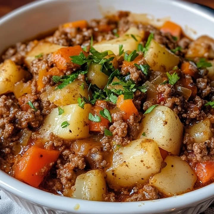 450 g Hackfleisch, 4 mittelgroße Kartoffeln, 2 große Karotten, geschält und in Scheiben, 1 kleine Zwiebel