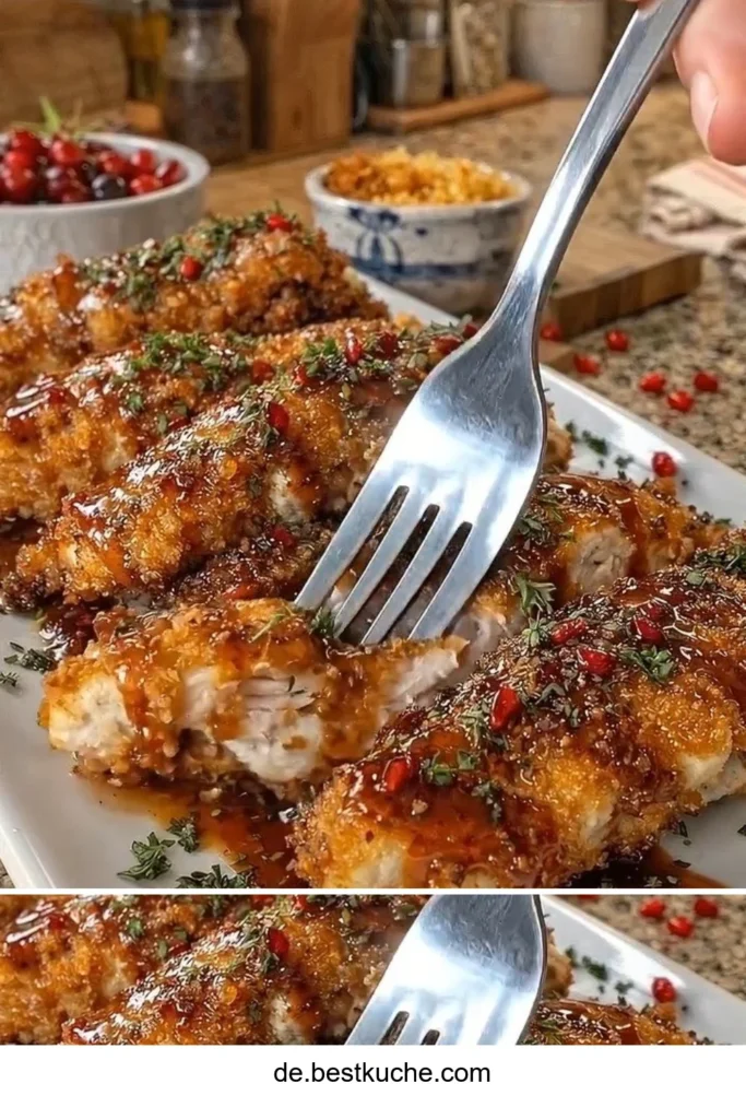 - Variante: Statt Hähnchen nimm feste Soja- oder Seitanstreifen, statt Rinderbacon verwenden Räuchertofu- oder Tempeh-Streifen, und karamellisiere mit etwas Kokosblütenzucker. Die Aromen bleiben rauchig-süß, die Textur ist überraschend ähnlich. Wenn du vegane Ideen suchst, passt dazu auch ein einfaches Brotrezept wie Brot mit Butter und Senf gut als Beilage.