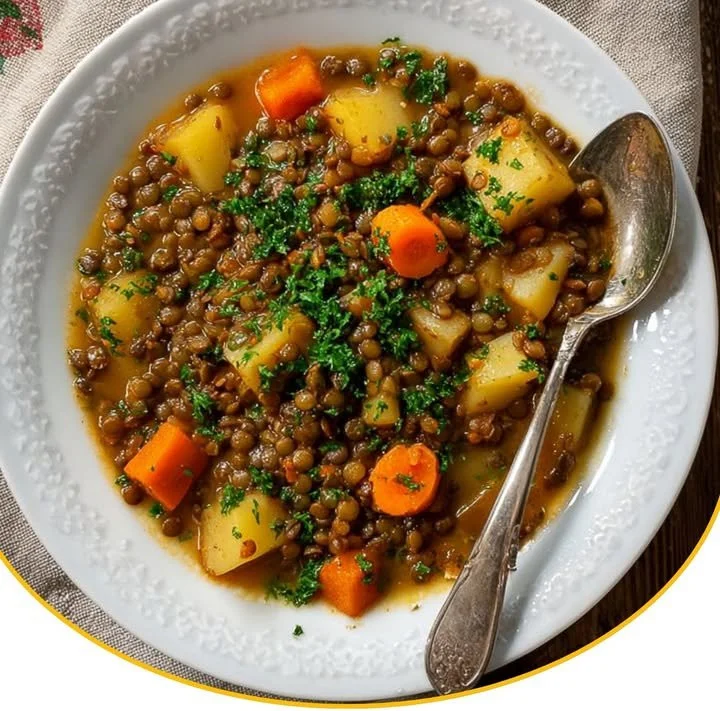 Ein einfaches, nahrhaftes Gericht für kalte Winterabende, das Linsen und Kartoffeln kombiniert, gewürzt mit frischen Kräutern und Gewürzen.